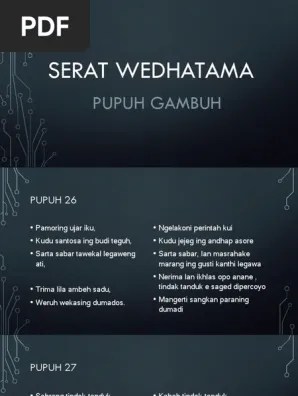 View serat wedhatama pada 4.docx from com misc at university of liverpool. Galeribuku.com merupakan toko buku online yang menyediakan buku pilihan dan terbaik. serat, tegesé tulisan utawa kasusastran, wédha, tegesé kawruh utawa ajaran, lan tama, dumadi saka tembung utama kang tegesé apik, dhuwur utawa luhur. Topaz raya c2 no.12 permata puri media, kembangan, jakarta barat, dki jakarta, indonesia; Penulis adalah redaktur pelaksana alif.id.