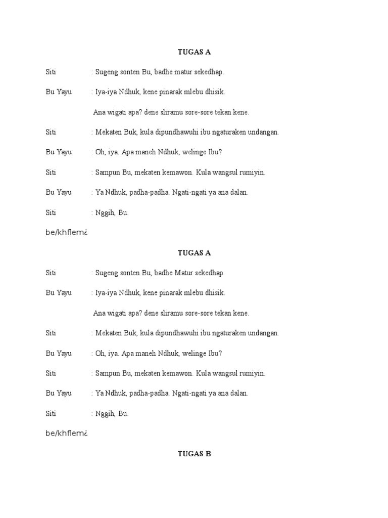 Kontributor setiap konten di bank soal bertanggungjawab sepenuhnya terhadap isi dan kebenaran materi. Contoh pacelathon bahasa jawa pamit bapak / ibu arep mangkat sekolah. Contoh pacelathon antara anak muda dengan yang lebih dewasa. Arep apik malah dadi memala. "nduk virus corona kui virus jenis anyar sek ditemokake.